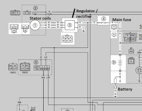 Not much at all to these circuits , just the rotor stator that generators the electric current AC current , this AC current is then rectified to DC current and regulated to 14v DV by the regulator rectifier, It passes the main fise on its way to the battery where is charges the battery.